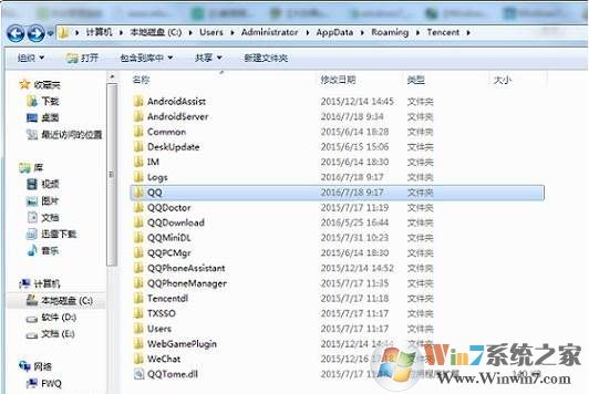 3、打開電腦中的QQ文件夾:C:\用戶\你的帳戶名\AppData\Roaming\Tencent,比如進(jìn)入C:\Users\Administrator\AppData\Roaming\Tencent,在該目錄下的QQ文件夾;