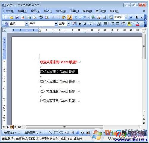 如下:選中第一排中的“歡迎大家來到Word聯(lián)盟!”,然后鼠標單擊常用工具欄上的“格式刷”按鈕;此時,光標左邊就會多出一個刷子一樣的東西,用鼠標選擇第2排;松開鼠標后,你就可以發(fā)現(xiàn)第2排已經(jīng)完全的復制了第1排的格式啦!~