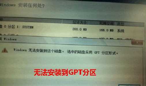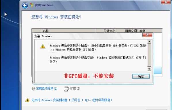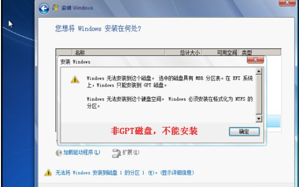 錯誤提示2:windows 無法安裝到這個磁盤,選中的磁盤采用GPT分區(qū)形式;