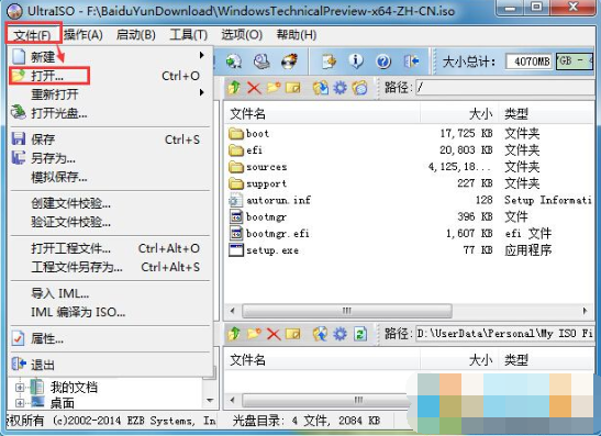 1、將U盤插到電腦上然后打開UltraISO軟件,點擊文件打開你下載好的Win7光盤鏡像ISO文件,如下圖;