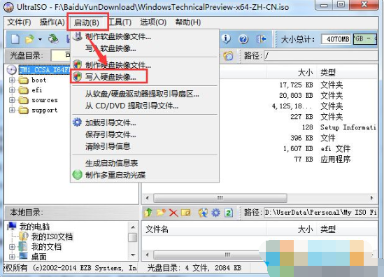 2、打開ISO文件后,點擊工具欄上的“啟動”,然后選擇“寫入硬盤鏡像”;win7系統(tǒng)之家 m.cncxm.com 整理