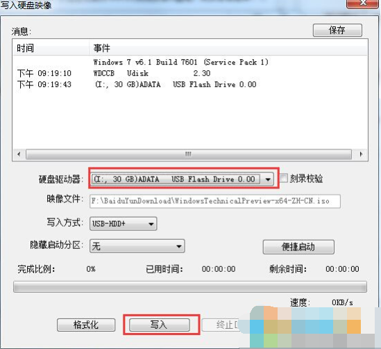 3、這時會彈出“寫入硬盤鏡像”窗口,確定好磁盤驅(qū)動器一項為你的U盤后,點擊寫入,中間出彈出格式化的提示,我們確認(rèn)一次就好了。