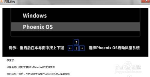 軟件很貼心,給用戶的提示,重啟后選擇phoenix os進(jìn)入安裝鳳凰系統(tǒng)