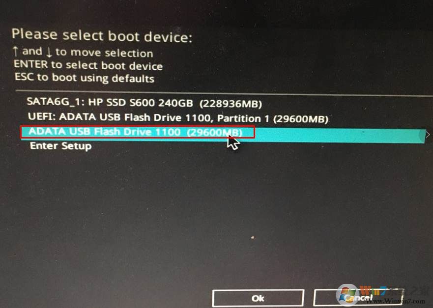 4、選擇到USB 也就是你的U盤(pán),如上圖小編是ADATA(威剛)的U盤(pán),然后回車即可從U盤(pán)啟動(dòng)了。