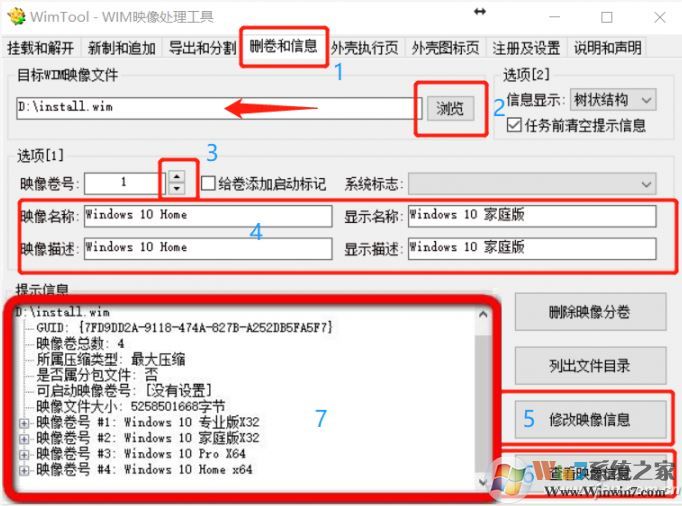 4、運行WimTool.exe,按照小編圖中提供的操作順序執(zhí)行,其中第二步是選擇拷貝到D盤并改名的鏡像*.wim文件。然后,跟著小編的提示一步步檢查、修改鏡像,步驟1和2選中鏡像文件后(如Win101803.wim),步驟3映像卷號會切換這個*.wim文件內(nèi)的不通版本系統(tǒng),選擇自己要集成到新*.wim文件的系統(tǒng)后,在提示4處定義自己需要的名稱(集成到新的*.Wim文件后方便識別)。注意,這里一定要記住要提取的卷號系統(tǒng)版本是幾(步驟3)!