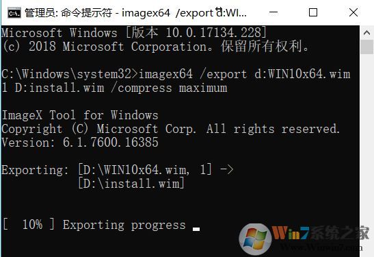 7、在命令提示符模式下,輸入命令imagex64 /export d:WIN10x64.wim 1 d:install.wim /compress maximum。注意,這個命令小編要特別說一下,imagex64或者imagex都可以,這是32/64位命令符工具的選擇問題。然后就是d:WIN10x64.wim,盤符是之前提取*.wim后的位置,WIN10x64.wim就是修改命名后被即將被提取的對象,d:install.wim則是合成后的鏡像名稱,不要搞錯。這個命令合并起來解釋就是,把保存在D盤的WIN10x64.wim中卷號為1的系統(tǒng)添加到新的install.wim文件中。如果有多個需要提取合成到新*.wim中就繼續(xù)輸入,區(qū)別就是卷號了(1那里),如下圖所示: