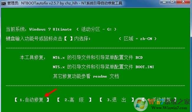 5、完成上一步,重啟直接進(jìn)入到win7,打開啟動菜單修復(fù)工具NTBootAutofix,點(diǎn)擊“自動修復(fù)”;