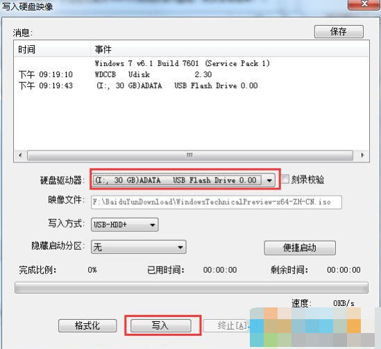 4、這時會彈出“寫入硬盤鏡像”窗口,確定好磁盤驅(qū)動器一項為你的U盤后,點擊寫入,中間出彈出格式化的提示,我們確認(rèn)一次就好了。