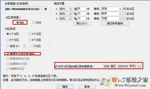 6、轉(zhuǎn)換完成后,執(zhí)行快速分區(qū),分區(qū)大小幾磁盤個(gè)數(shù)自己選擇,確保分區(qū)表類型為MbR ,及勾選了重建主引導(dǎo)記錄MBR,按下確定后開始分區(qū),如圖: