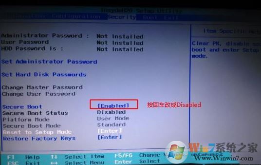 1、重啟計算機(jī),點(diǎn)擊開始菜單-- 電源按鈕-重啟,重啟之后一直按F2或(FN+F2)進(jìn)入BIOS,按→方向鍵切換到Security,選擇Secure Boot回車設(shè)置成Disabled,如圖: