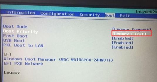 5、再把Boot Priority設(shè)置成Legacy First,按F10彈出窗口選擇yes回車,如圖: