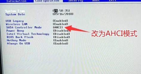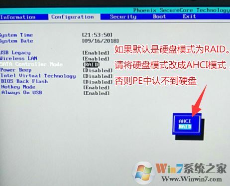 6、注意:再返回configuration這項,查看sata controller mode這項,如果默認硬盤模式為RAID,請將硬盤模式改為AHCI模式,否則進PE后不能認出硬盤,如果更改后記得按F10保存,如下圖所示;