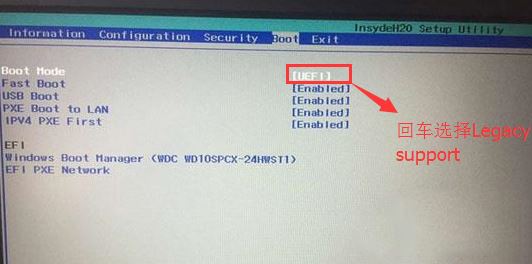 4、切換到Boot,把Boot Mode從UEFI改成Legacy Support;