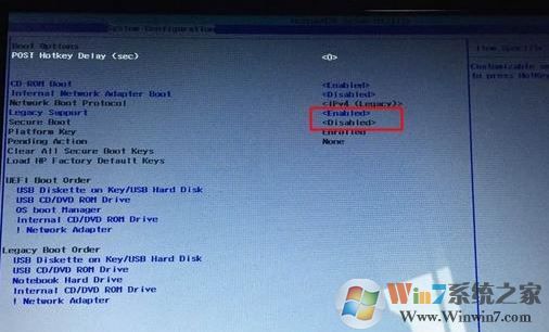 3、進(jìn)入后把Secure Boot設(shè)置成Disabled,再把Legacy Support設(shè)置成Enabled,按F10選擇Yes回車保存;