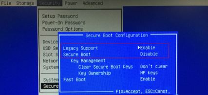 2、進入后先更改Secure Boot—disable,再更改Legacy Support—enable,更改完成后按F10保存,如圖:
