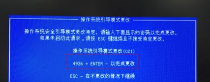 4、主機自動重啟,開機顯示操作系統(tǒng)引導模式更改,中間有四個隨機數字加回車,例如下圖:4936+ENTER,需要敲擊顯示的四個數字后按Enter鍵,否則之前更改的信息無法保存。(敲擊數字前需要確認小鍵盤是否已開啟,開啟后再敲擊,或者請按大鍵盤字母上面的一排數字鍵輸入);