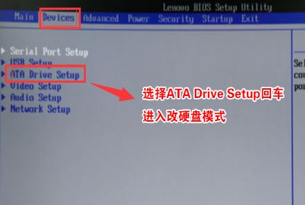 4、將鍵盤按方向左箭頭移動(dòng)Devices選項(xiàng),把鍵盤移動(dòng)ATA Drive Setup回車,將configure SATA as中默認(rèn)的raid改成ahci模式,否則安裝win7時(shí)會(huì)出現(xiàn)0x0000007b藍(lán)屏,因?yàn)閣in7中沒(méi)有集成raid硬盤驅(qū)動(dòng),然后選擇F10保存設(shè)置,在彈出的選項(xiàng)中選擇YES,如下圖所示;