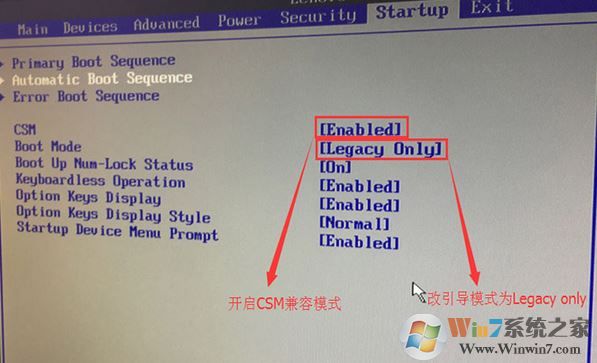 3、切換到Boot,把Boot Mode從UEFI改成Legacy only引導(dǎo)模式,再把csm默認(rèn)disabled改成enabled,開(kāi)啟兼容模式,選擇F10保存設(shè)置,在彈出的選項(xiàng)中選擇YES;