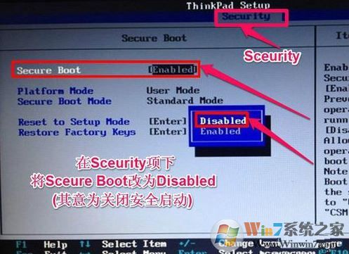 2、按→方向鍵移動到Security,將secure boot改成disabled,關(guān)閉安全啟動,如下圖所示;