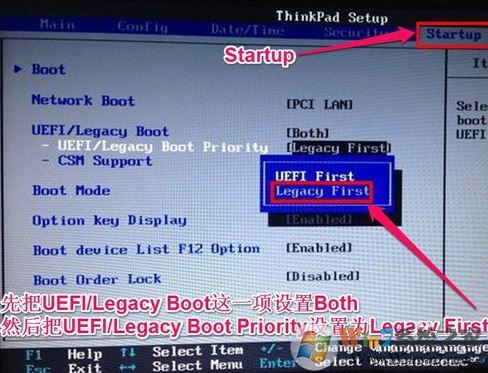 3、選擇startup,在UEFI/legac boot priority下,設(shè)置為Legacy First(傳統(tǒng)模式優(yōu)先)。
