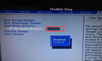 4、在Restart下,選擇OS Optimized Defaults回車,改成Disabled或Other OS,接著選擇Load Setup Defaults回車進(jìn)行加載,然后按F10保存設(shè)置。