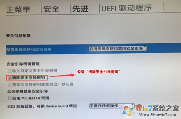 4、F10保存重啟后再次開(kāi)機(jī)按ESC,然后選擇F10進(jìn)入BIOS設(shè)置,將進(jìn)入剛設(shè)置的地方,勾選“清除安全引導(dǎo)密鑰”,然后再次F10保存;