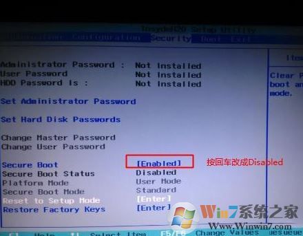 1、開機(jī)一直按F2或(FN+F2)進(jìn)入BIOS,按→方向鍵切換到Security,選擇Secure Boot回車設(shè)置成Disabled,如圖: