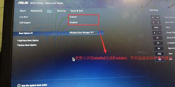 2、重啟后切換到BOOT的選項,分別把fast boot和csm support由disabled改成enabled,分別開啟快速啟動和兼容模式;