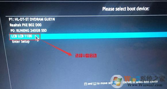 3、插入U盤啟動盤,重啟按ESC選擇識別到U盤啟動項,回車;