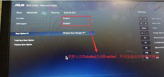 2、重啟后切換到BOOT的選項,分別把fast boot和csm support由disabled改成enabled,分別開啟快速啟動和兼容模式,如圖所示: