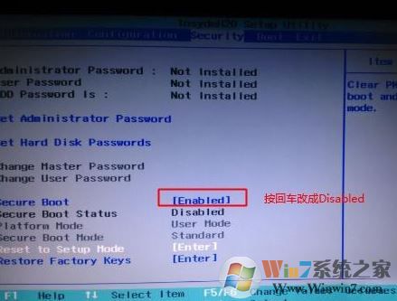 1、開機(jī)一直按F2或(FN+F2)進(jìn)入BIOS,按→方向鍵切換到Security,選擇Secure Boot回車設(shè)置成Disabled;