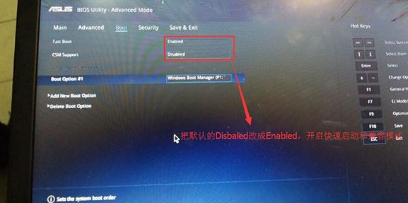 2、重啟后切換到BOOT的選項(xiàng),分別把fast boot和csm support由disabled改成enabled,分別開啟快速啟動(dòng)和兼容模式,如圖: