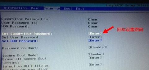 2、如果Secure Boot灰色無法設(shè)置,則轉(zhuǎn)到Security,選擇Set Supervisor Password回車設(shè)置密碼,再返回BOOT選項,將Secure BOOT默認(rèn)enabled為disabled,(注:改完secure boot后再設(shè)置密碼為空即可,要不每次進BIOS都要設(shè)置)如下圖所示;