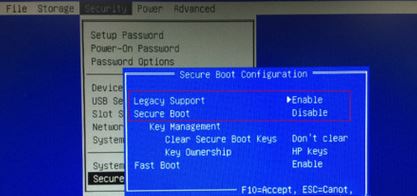 1、開機(jī)一直按F10進(jìn)入BIOS,如果沒反應(yīng)則啟動(dòng)時(shí)按ESC,出現(xiàn)以下界面后,再按F10進(jìn)入BIOS,切換到Security選項(xiàng)--Secure Boot Configuration點(diǎn)擊回車鍵,如果彈出紅色界面,請(qǐng)按F10接受,如圖:
