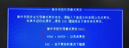 4、主機(jī)自動(dòng)重啟,開機(jī)顯示操作系統(tǒng)引導(dǎo)模式更改,中間有四個(gè)隨機(jī)數(shù)字加回車,例如下圖:4936+ENTER,需要敲擊顯示的四個(gè)數(shù)字后按Enter鍵,否則之前更改的信息無法保存。(敲擊數(shù)字前需要確認(rèn)小鍵盤是否已開啟,開啟后再敲擊,或者請(qǐng)按大鍵盤字母上面的一排數(shù)字鍵輸入),如圖: