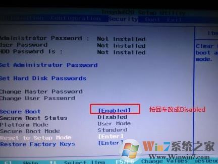 1、開機一直按F2或(FN+F2)進入BIOS,按→方向鍵切換到Security,選擇Secure Boot回車設置成Disabled;