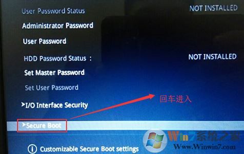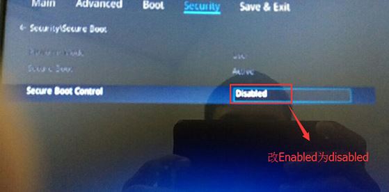 3、按→方向鍵移動(dòng)到Security,選擇Secure Boot,然后回車進(jìn)入把Secure Boot control選enabled改為disabled關(guān)閉安全啟動(dòng),然后按F10保存重啟;