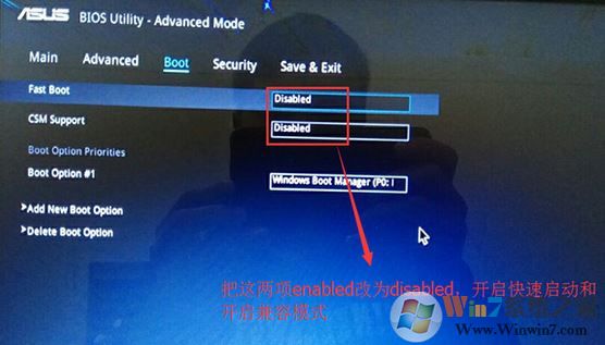 4、重啟后切換到BOOT的選項(xiàng),分別把fast boot和csm support由disabled改成enabled,分別開(kāi)啟快速啟動(dòng)和兼容模式;