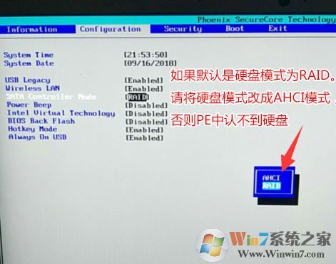 6、注意:再返回configuration這項(xiàng),查看sata controller mode這項(xiàng),如果默認(rèn)硬盤模式為RAID,請將硬盤模式改為AHCI模式,否則進(jìn)PE后不能認(rèn)出硬盤,如果更改后記得按F10保存,如下圖所示;