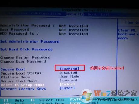 1、開機(jī)一直按F2或(FN+F2)進(jìn)入BIOS,按→方向鍵切換到Security,選擇Secure Boot回車設(shè)置成Disabled;