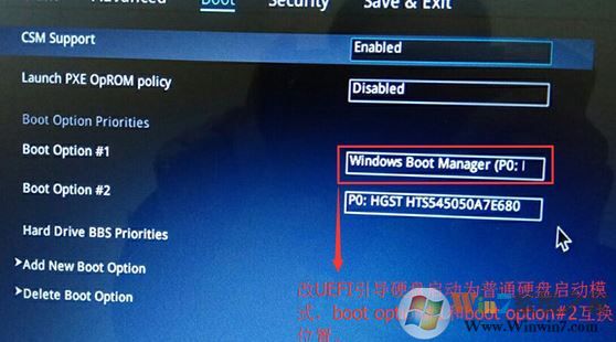 4、繼續(xù)把boot option#1選項改為普通引導(dǎo)的,boot option#1和boot option#2硬盤啟動位置對換,設(shè)置第一啟動項為普通硬盤引導(dǎo),帶Windwos Boot Manager的為UEFI引導(dǎo)分區(qū);
