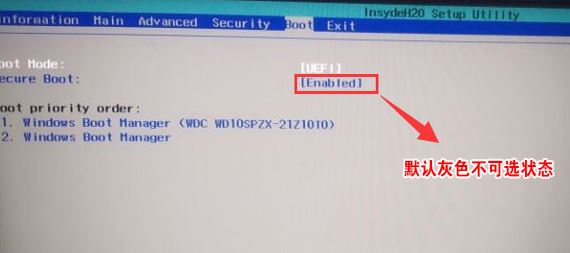 1、開機(jī)一直按F2進(jìn)入BIOS,按F2進(jìn)入BIOS界面,首先我們要關(guān)閉安全啟動(dòng)(secure boot選項(xiàng)默認(rèn)為enabled),切換BOOT項(xiàng)后發(fā)現(xiàn)secure boot灰色不可選狀態(tài),如圖: