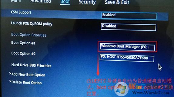 3、把boot option#1選項(xiàng)改為普通引導(dǎo)的,boot option#1和boot option#2硬盤啟動(dòng)位置對換,設(shè)置第一啟動(dòng)項(xiàng)為普通硬盤引導(dǎo),帶Windwos Boot Manager的為UEFI引導(dǎo)分區(qū);