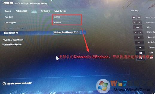2、重啟后切換到BOOT的選項(xiàng),分別把fast boot和csm support由disabled改成enabled,分別開啟快速啟動(dòng)和兼容模式;