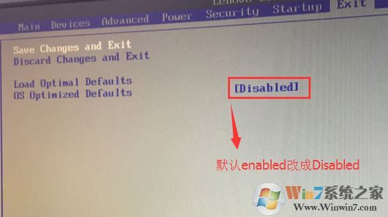2、轉(zhuǎn)到Exit,把OS Optimized Defaults設(shè)置為Disabled;
