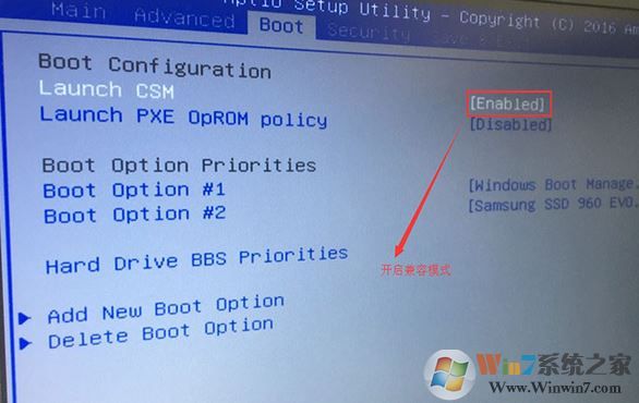 2、重啟后切換到BOOT的選項,把Launch CSM由disabled改成enabled,開啟兼容模式;