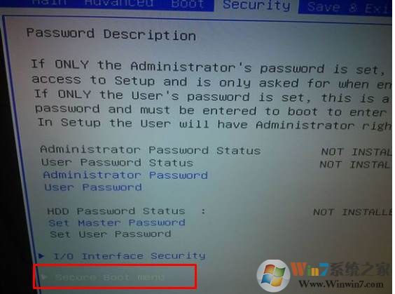 1、重新啟動電腦后我們按F2進入到BIOS,進入后進入security菜單,把菜單下的secure boot 的enable改成disable;(這個步驟是關(guān)閉安全啟動)