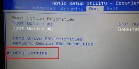 2、轉(zhuǎn)到Boot界面,選擇UEFI Setting回車;