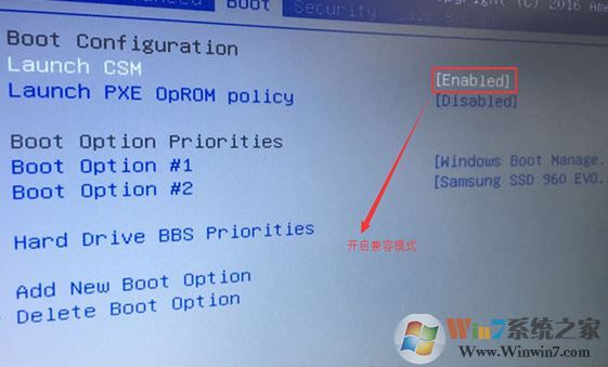 2、重啟后切換到BOOT的選項(xiàng),把Launch CSM由disabled改成enabled,開(kāi)啟兼容模式;