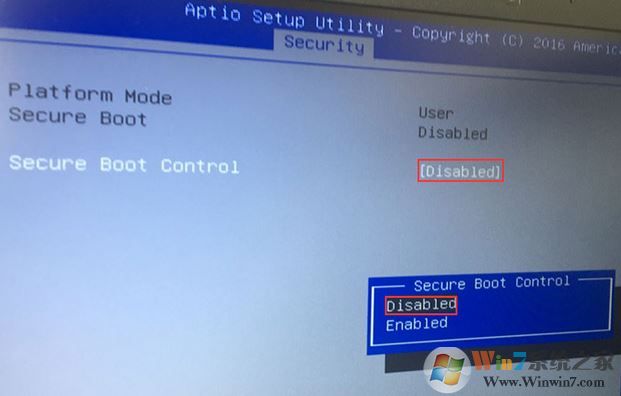 4、使用方向鍵上下鍵選擇 Secure Boot Control ,然后將其修改為DISabled(一步的作用是關閉微軟的Secure BOOT,這個功能開啟會導致不能識別U盤啟動系統(tǒng)的安裝);
